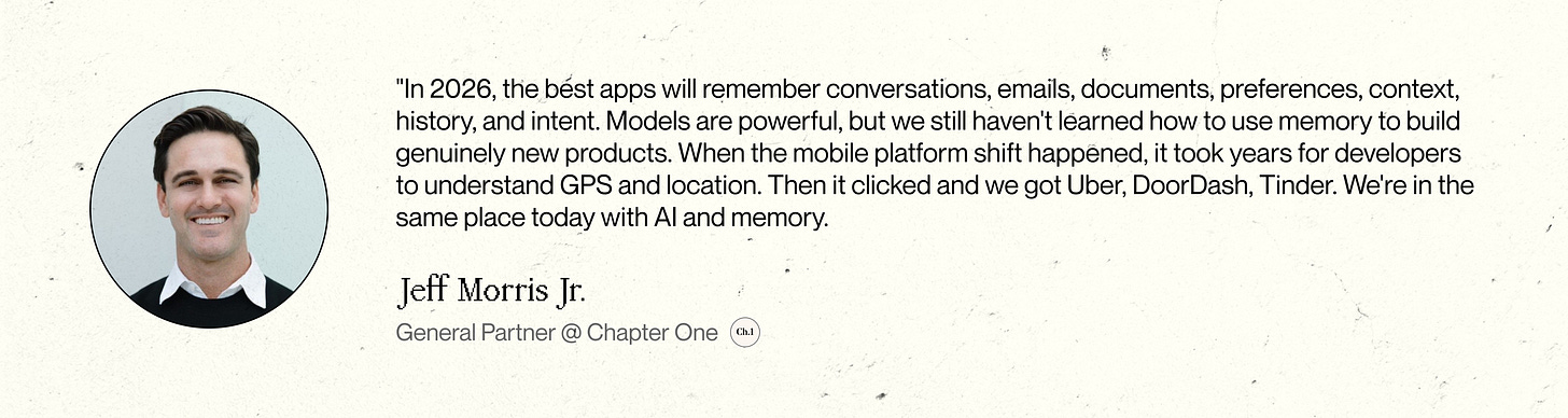 Why this matters: Memory is the missing ingredient that will unlock the next wave of AI products. Just as location-awareness created entirely new categories that didn't exist before, persistent memory will enable products impossible today. The first companies to crack memory-driven products will have defensible moats that last for decades.