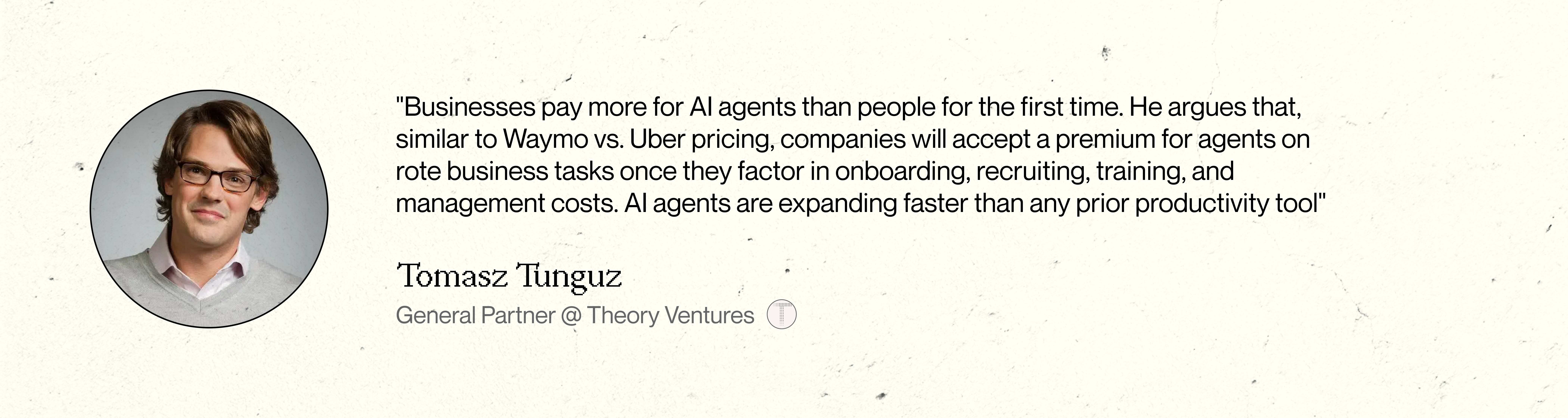 Why this matters: This inverts the entire SaaS pricing model. Instead of paying for access to software, you pay for outcomes. This means AI vendors must be confident their agents will deliver results – and it eliminates the inefficiency of buyers paying for tools they don't fully utilize. This is the shift from seat-based to performance-based economics.