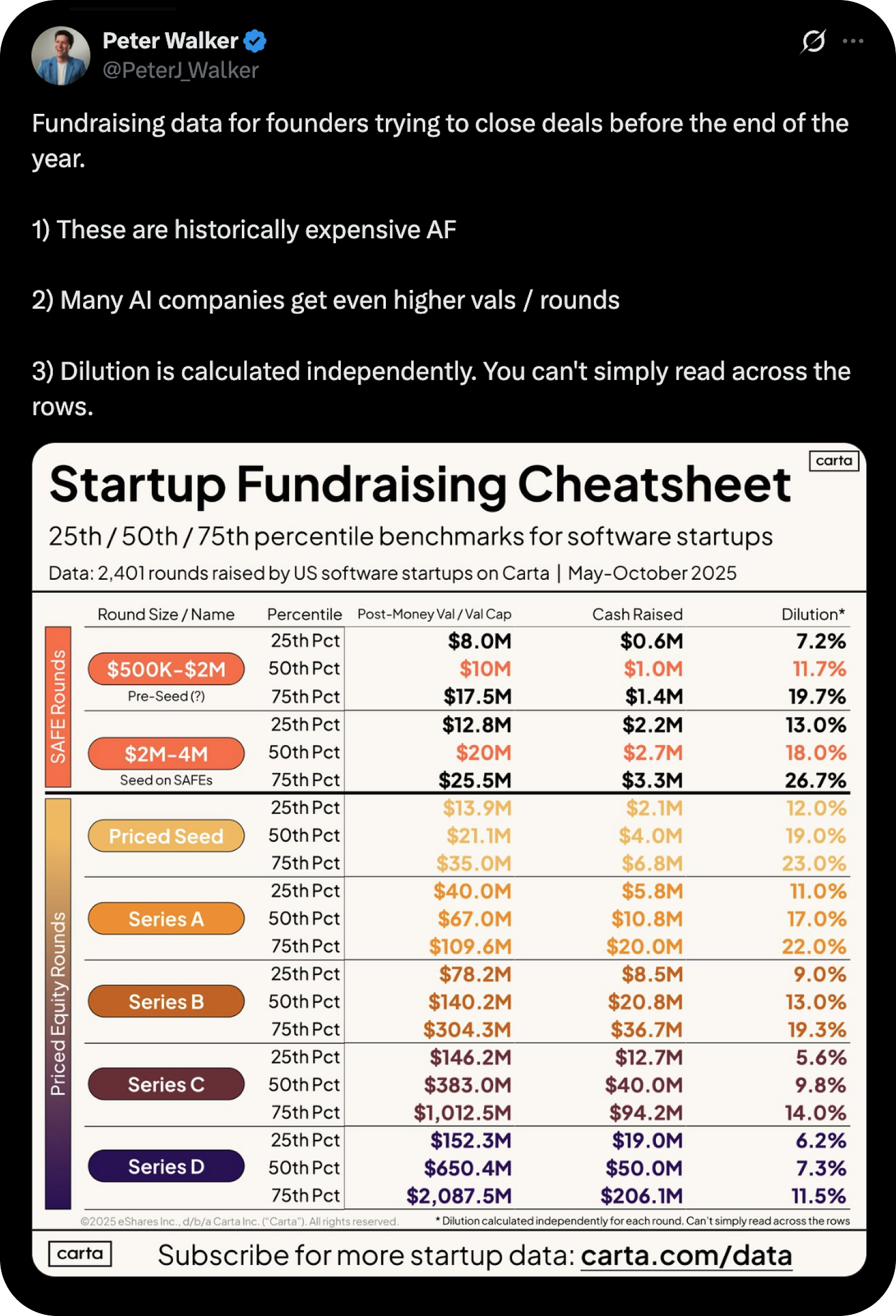 “Fundraising data cheatsheet: round sizes, valuations, dilutions”
