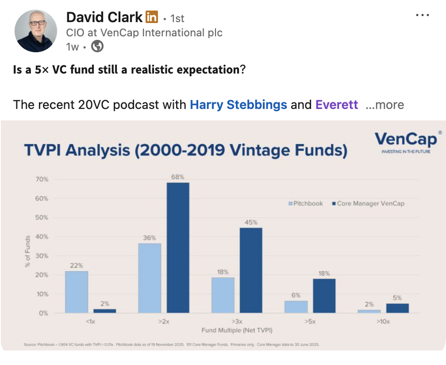 Another great episode: 20VC with Benchmark GP Everett Randle on why mega funds struggle to generate real cash-on-cash returns and why Benchmark is staying small and ultra‑concentrated. He argues why investors should stop fixating on margins and focus on gross profit per customer, weighs OpenAI vs. Anthropic, and shows how fund size quietly shapes strategy.